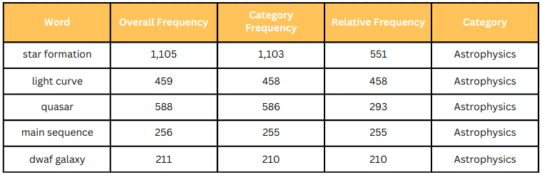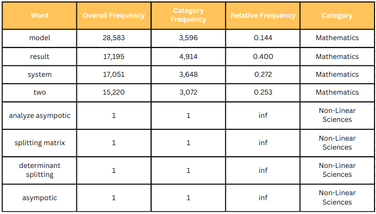 The heart of our project was all about finding those special words that could help us classify papers accurately. We started by building a word bank from our cleaned-up data, focusing on words that stood out in specific categories. The crux of our methodology lies in the calculation of relative frequency for each keyword, using the formula