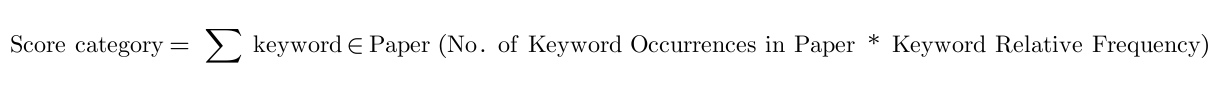 With our carefully curated list of keywords, we were ready to classify new papers. We calculate a score for each category. That is a weighted sum, in which each keyword’s contribution depends on its frequency in the text and its predefined weight, derived from our earlier analysis.