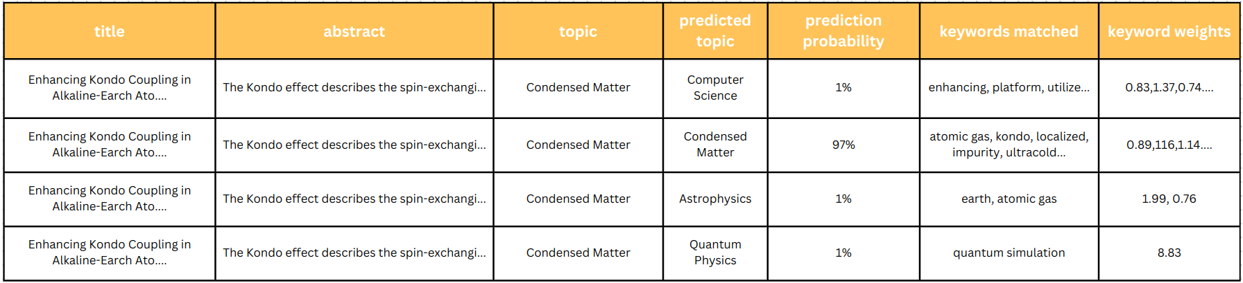 In the following example, the actual category for the paper is “Condensed Matter” and as seen in the predicted categories, the “Condensed Matter” has the highest probability of 96%. And keywords like “atomic gas”, “impurity” and “ultracold” contributed to this classification.